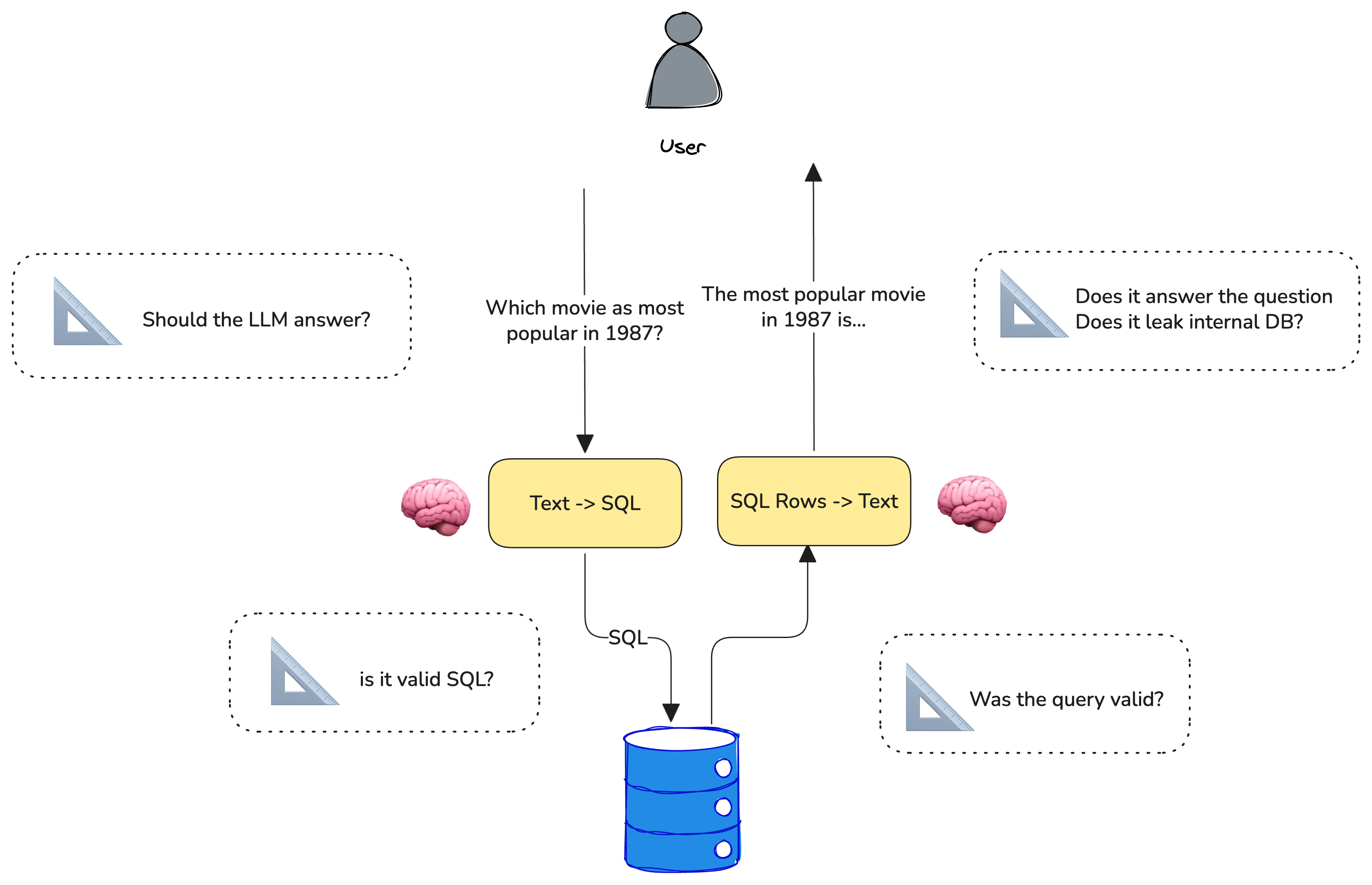 - We want the output to be pure SQL (select * from ...). LLMs tend to respond in markdown. Let's try to make sure it doesn't
