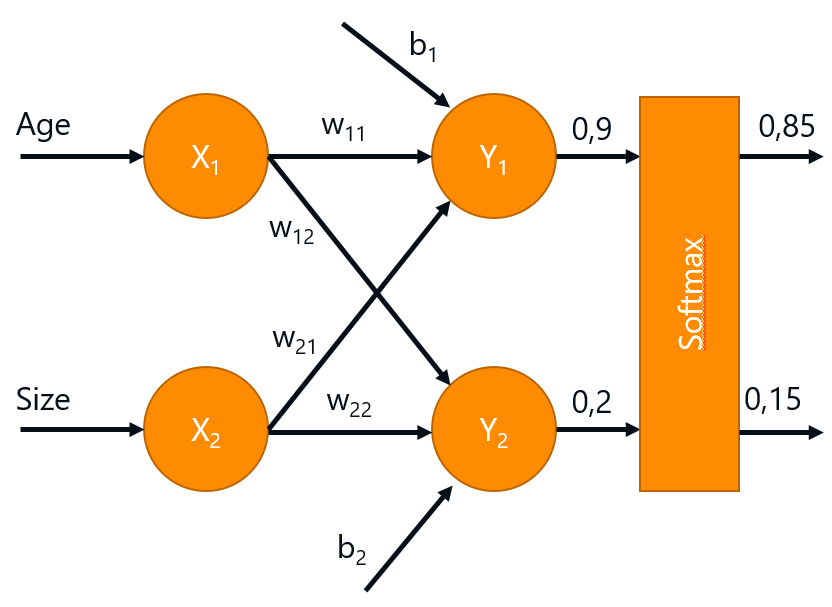 We have generated a dataset for binary classification problem. However, let's consider it as multi-class classification right from the start, so that we can then easily switch our code to multi-class classification. In this case, our one-layer perceptron will have the following architecture: